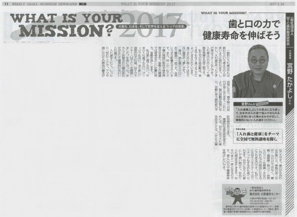 お知らせ 大阪日日新聞に代表理事宮野たかよしの2017年の抱負が掲載されました。 2017.01.17 宮野のミッションとして以下のように掲載されました。「入れ歯職人」としての原点に立ち戻って、日本中の入れ歯で悩んでおられる人に生体に合った噛み合わせが正しく、審美的にもいい入れ歯を作りたい。また、今年の抱負として以下のように掲載されました。「入れ歯と健康」をテーマに全国で無料講座を開く。 2017年1月23日400名規模の講演を行います。 前の記事 コミスタ神戸で「入れ歯と健康」講演を行いました。 次の記事