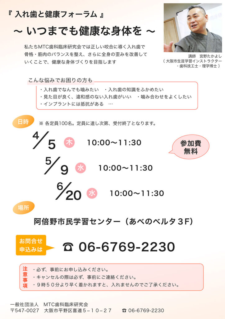 阿倍野市民学習センター(あべのベルタ3F)にて入れ歯と健康講座を開催します。入れ歯でなんでも噛みたい・入れ歯の知識をふかめたい・見た目が良く、違和感のない入れ歯がいい・噛み合わせをよくしたい・インプラントには抵抗がある という方は是非ご参加ください。